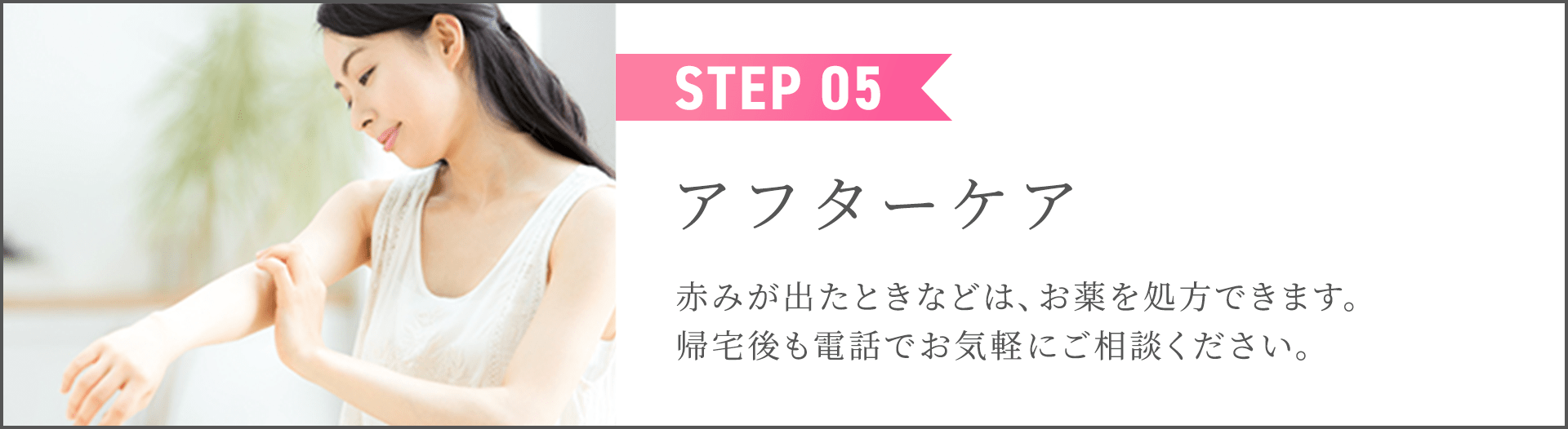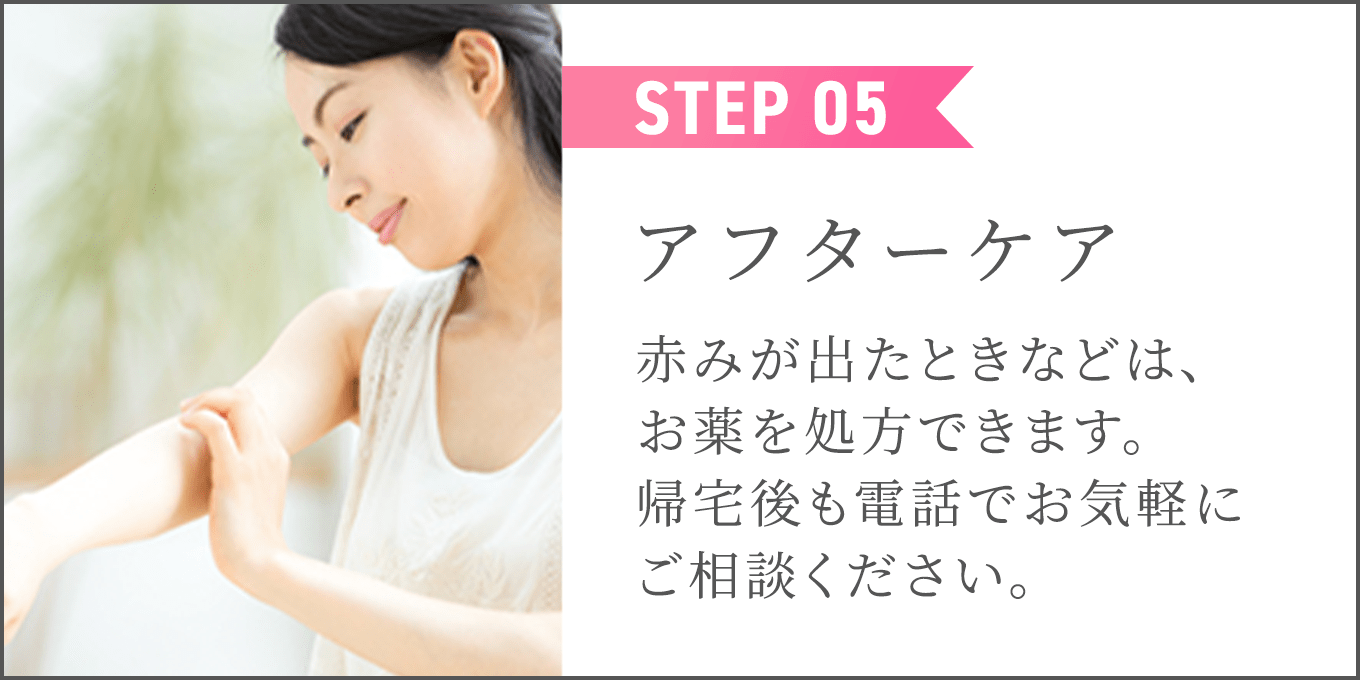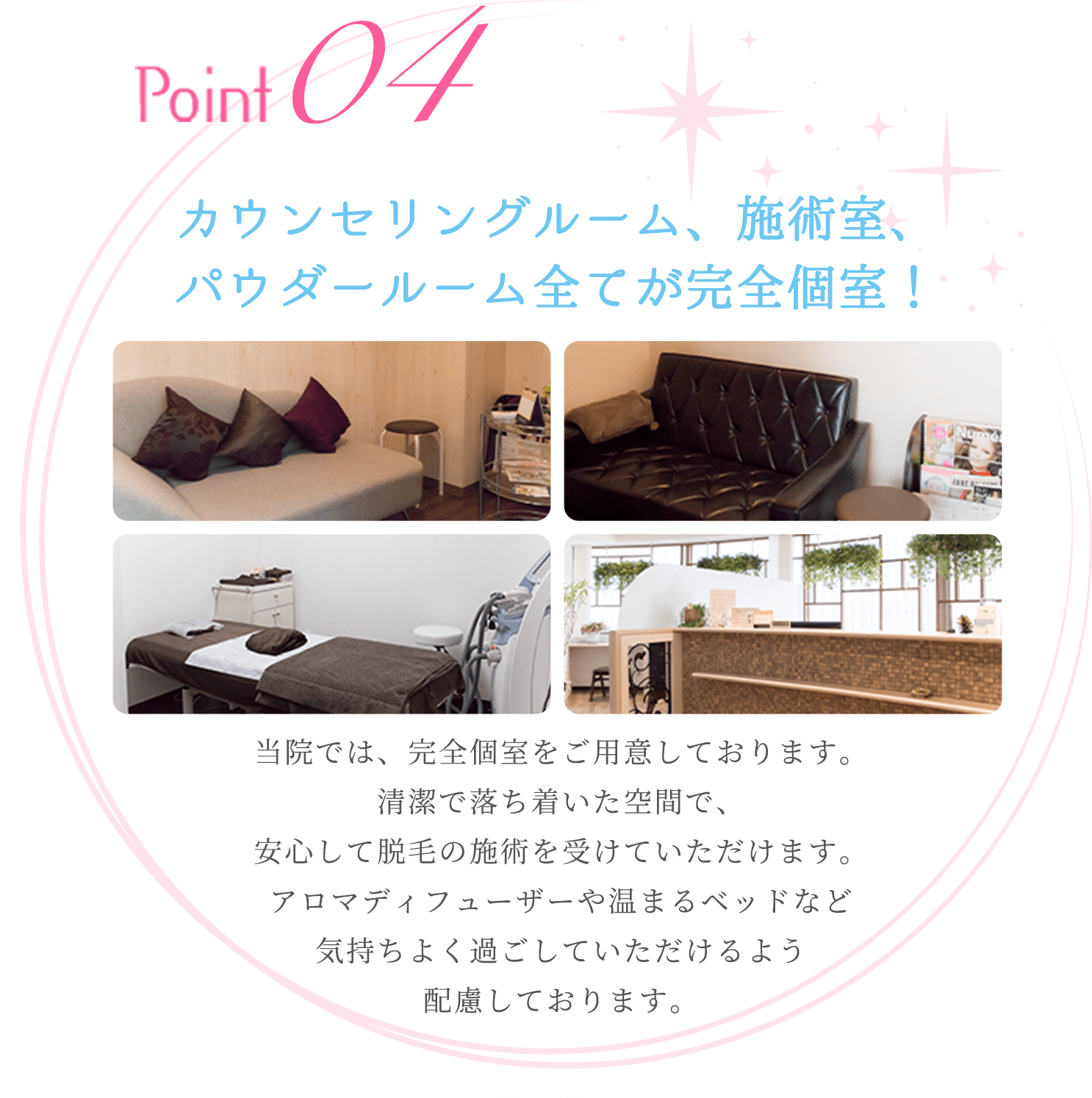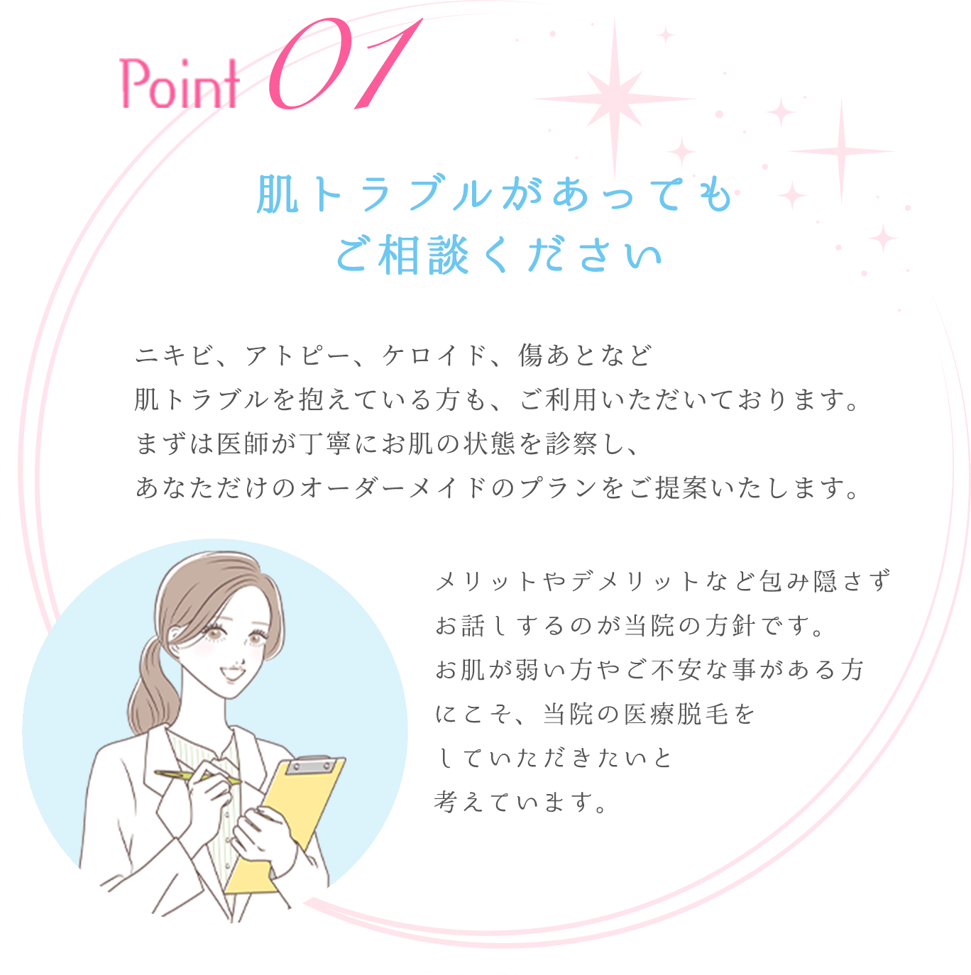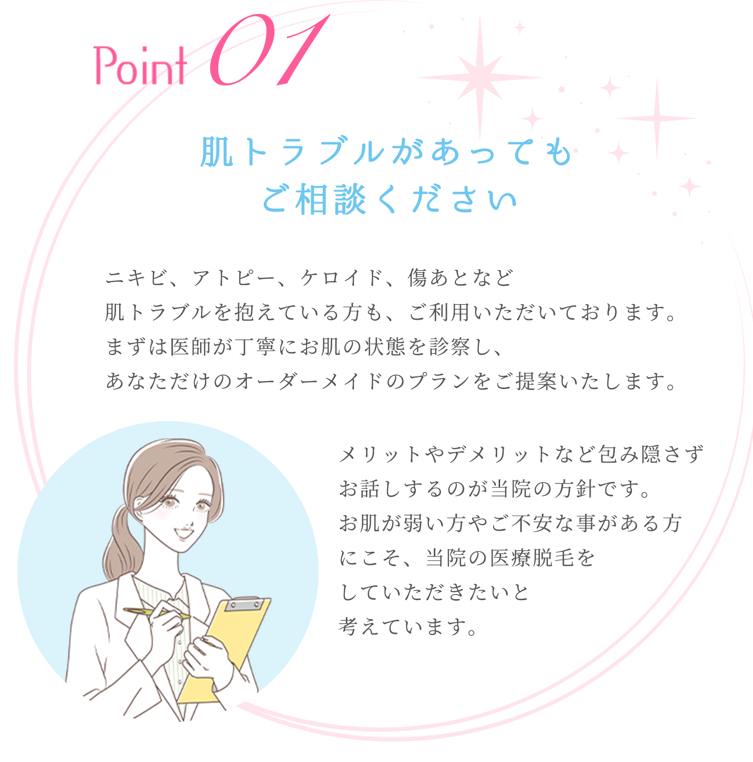 お肌のトラブルをお持ちの方など、どんな方でも脱毛結果を出すことを一番に考え、丁寧で確実な施術を心がけています。