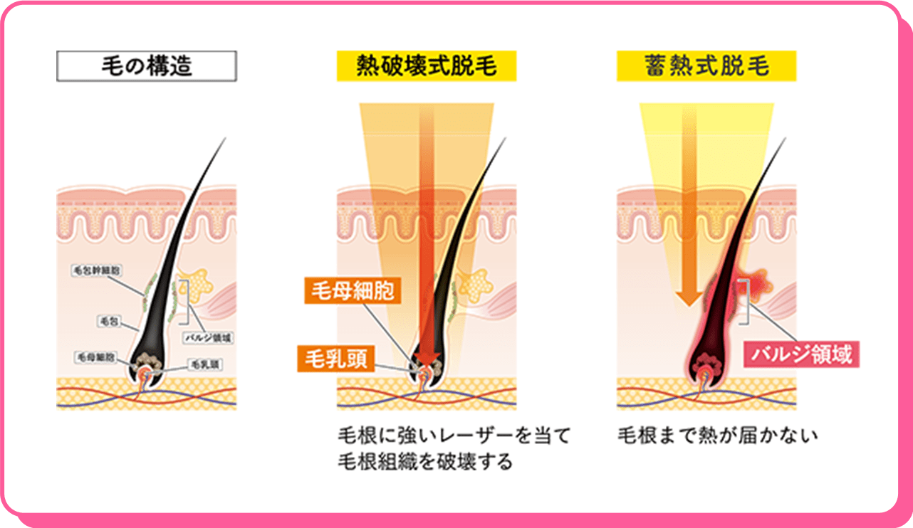 脱毛器は大きく2つの種類に分けられます。毛根に直接レーザーを照射し、毛根を破壊させる熱破壊式と、じんわりと毛根に熱を加えて脱毛する蓄熱式。